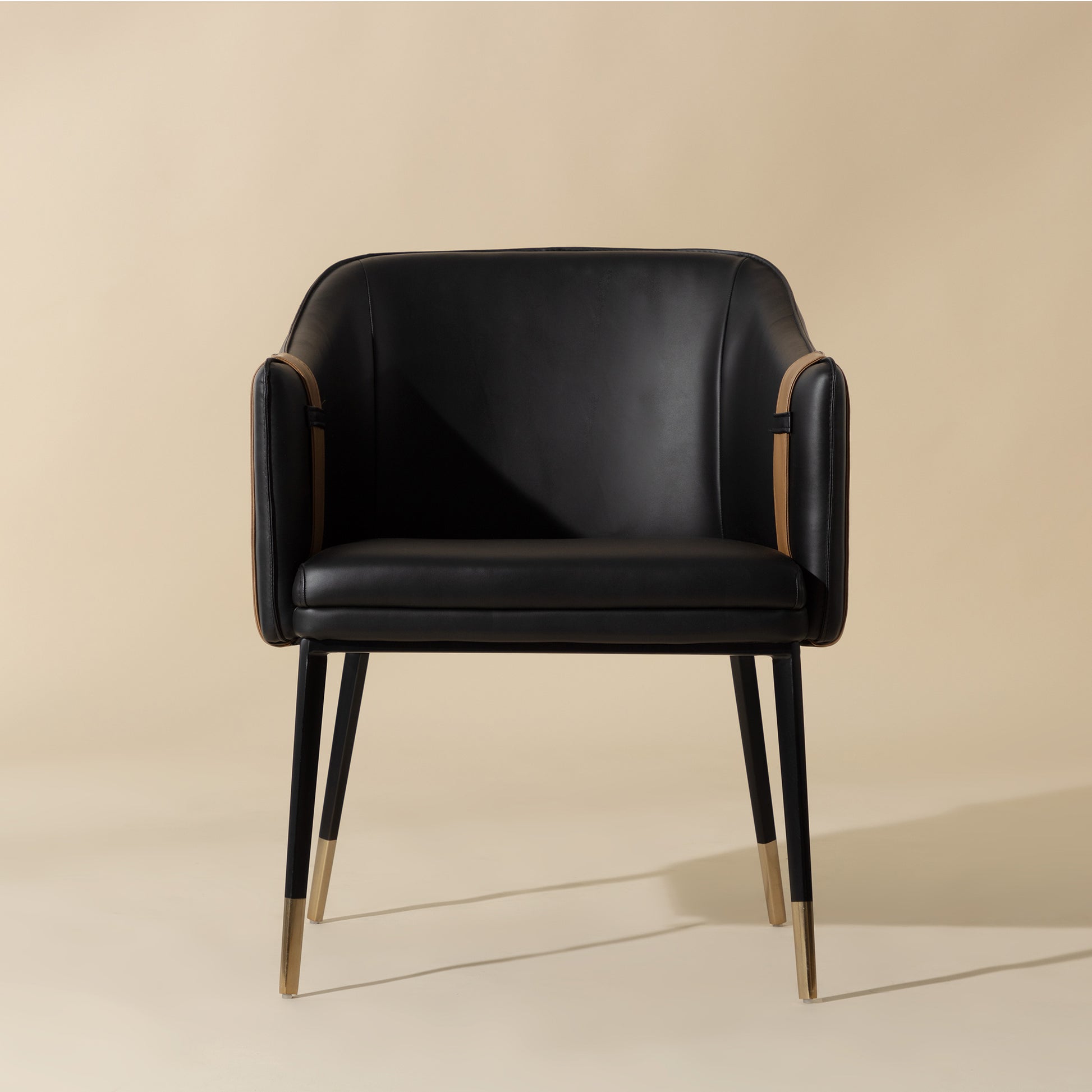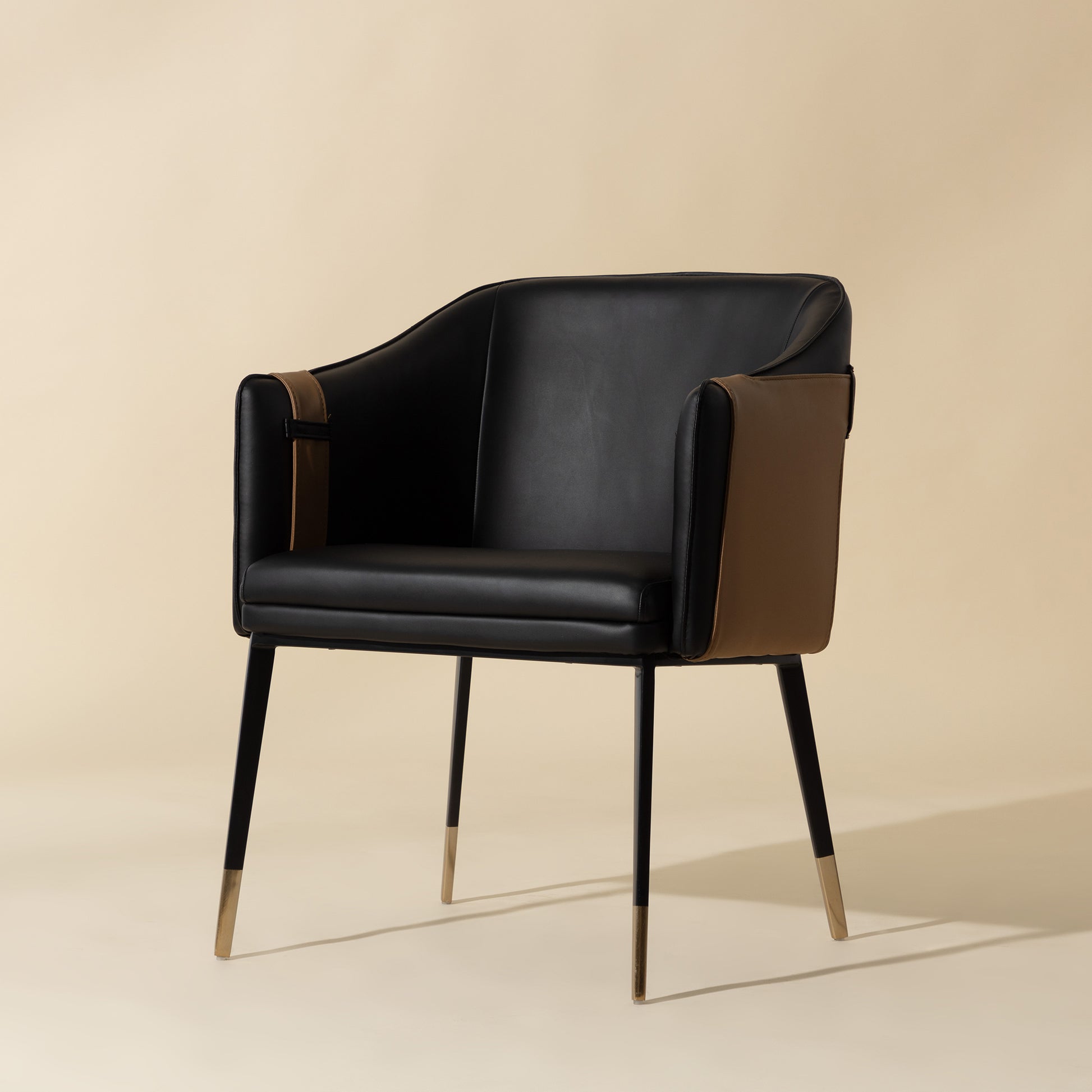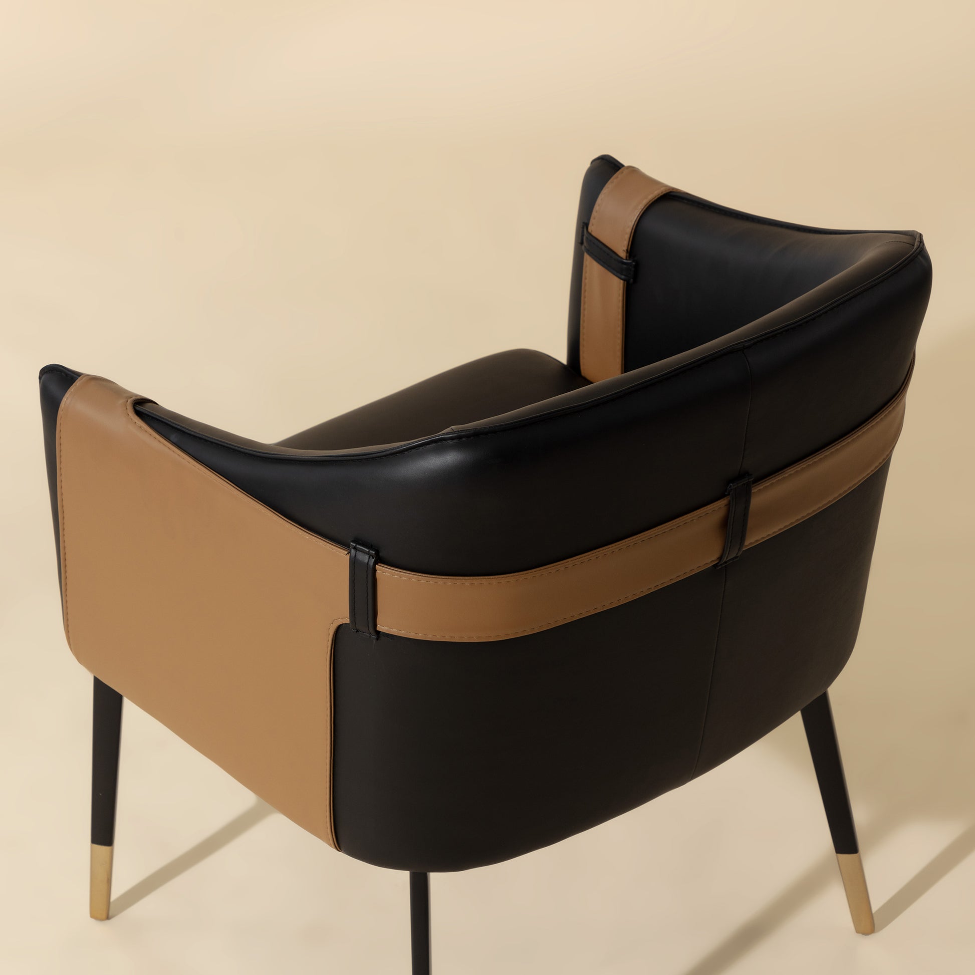Un exclusivo sillón de comedor con respaldo abarrilado, tapizado en suave piel sintética color napa negra y realzado con un exterior en contraste de piel sintética color napa color coñac. Acabado con patas de acero negro y tapas de cobre. Ideal para espacios residenciales y comerciales. Cuidado: Este diseño está elaborado con piel sintética. La piel sintética se fabrica para reflejar las características naturales del cuero; por lo tanto, las variaciones de color, las marcas, arrugas, surcos y ligeros arañazos son características apreciadas. No hay dos piezas iguales. Visite nuestra página de Cuidado del Producto para obtener más información sobre cómo garantizar la belleza duradera de esta pieza.