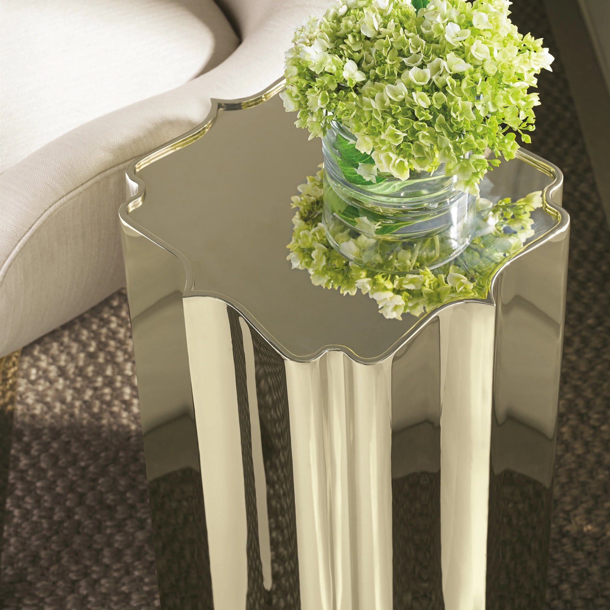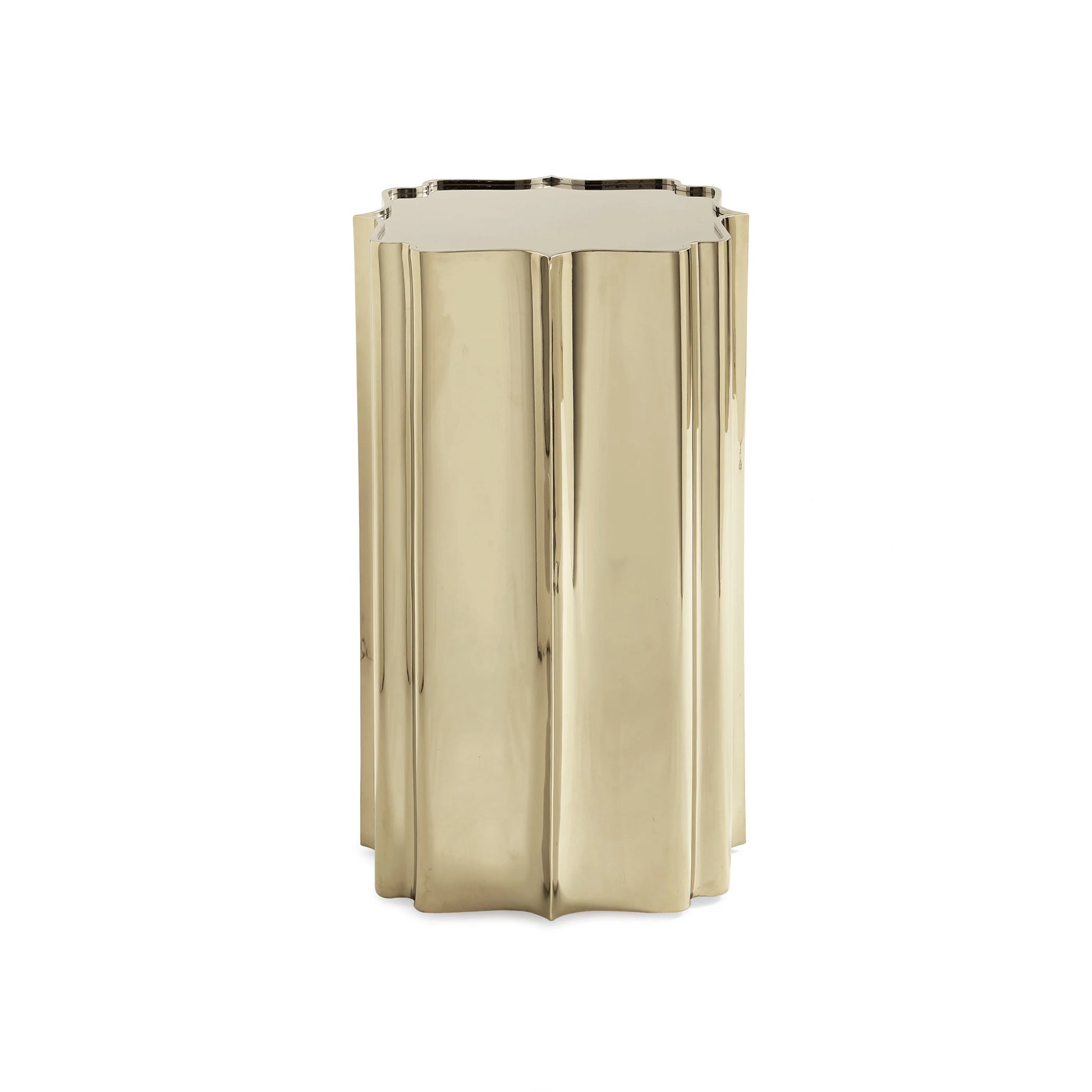 El metal en Whisper of Gold brillante ha sido trabajado para crear una mesa lateral columnar con un borde ondulado de estilo lírico. El ligero borde elevado alrededor de la parte superior mantiene las bebidas en su lugar.